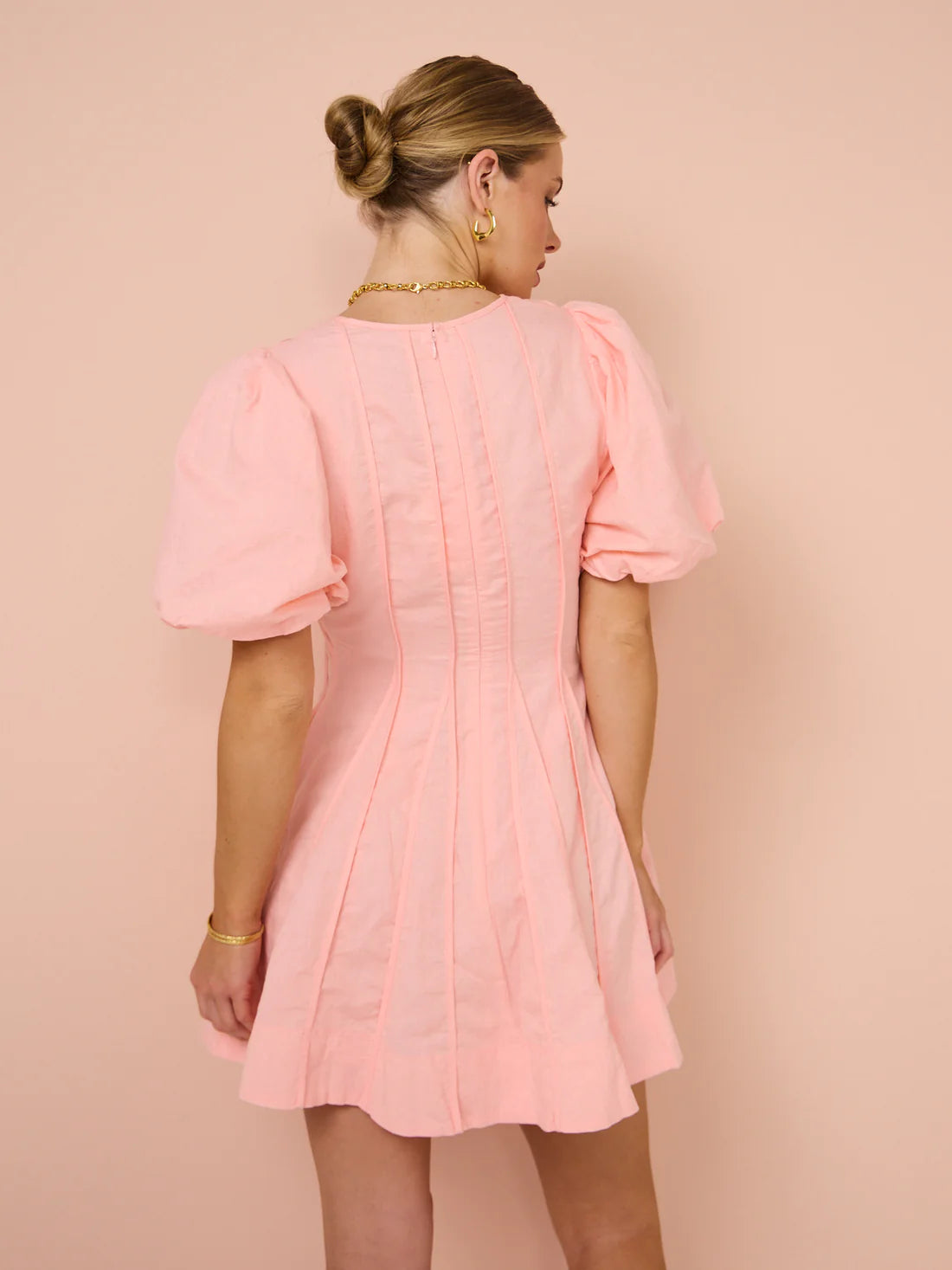 ◦ This mini dress features a plunged curved V neckline, fully lined puff sleeve with encased gathering, fitted waist, wide flowy bottom hem and vertical bind seam detail.