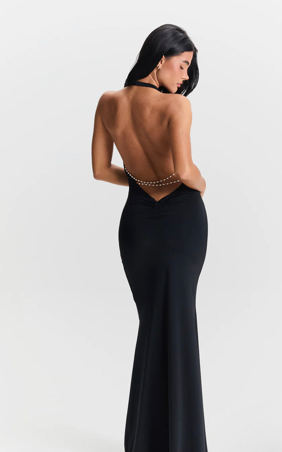 Introducing our Harper Maxi dress. Based off our best selling Naomi Top, Harper was designed to turn heads and elevate your look on your next night out. Featuring a plunging cowl neckline with a daring open back adorned by our signature pearl chains, the Harper was designed to compliment you in all the right places. Made from our signature buttery soft fabric with a small ruching channel at your lower back, it is fully lined to give you the most flattering silhouette.