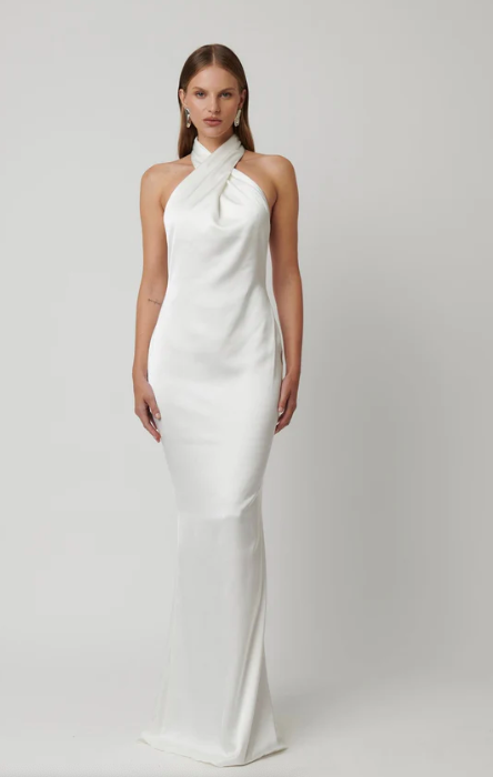 Elegance meets simplicity with the Kaia Gown in ivory. This stunning halter-neck dress features a sleek, figure-hugging fit with a luxe satin finish. Perfect for formal events, weddings, or special occasions.