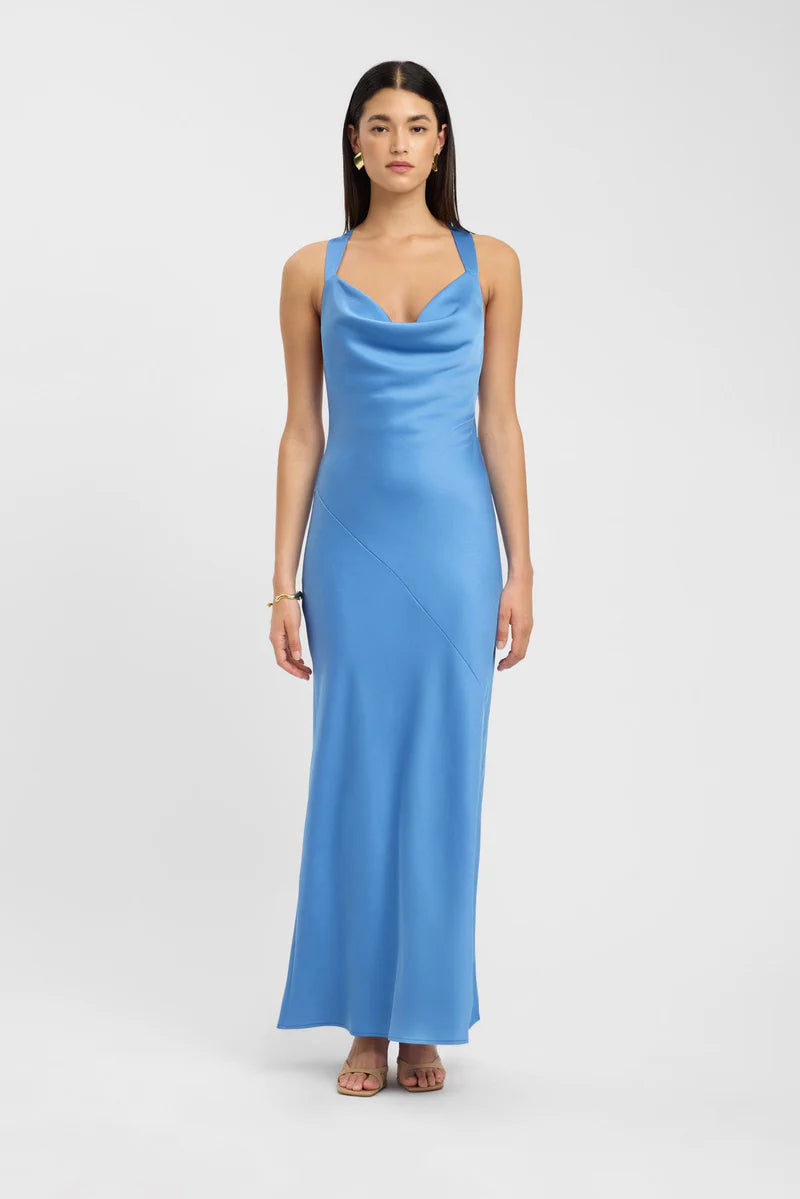 The Palermo Cowl Maxi is a luxurious and elegant piece. Crafted from a soft blue satin-like fabrication, it features a classic silhouette with a modern twist. The cowl neckline, low back, and cross-back detail add a touch of sophistication, while the soft drape of the fabric creates a flattering and feminine look.