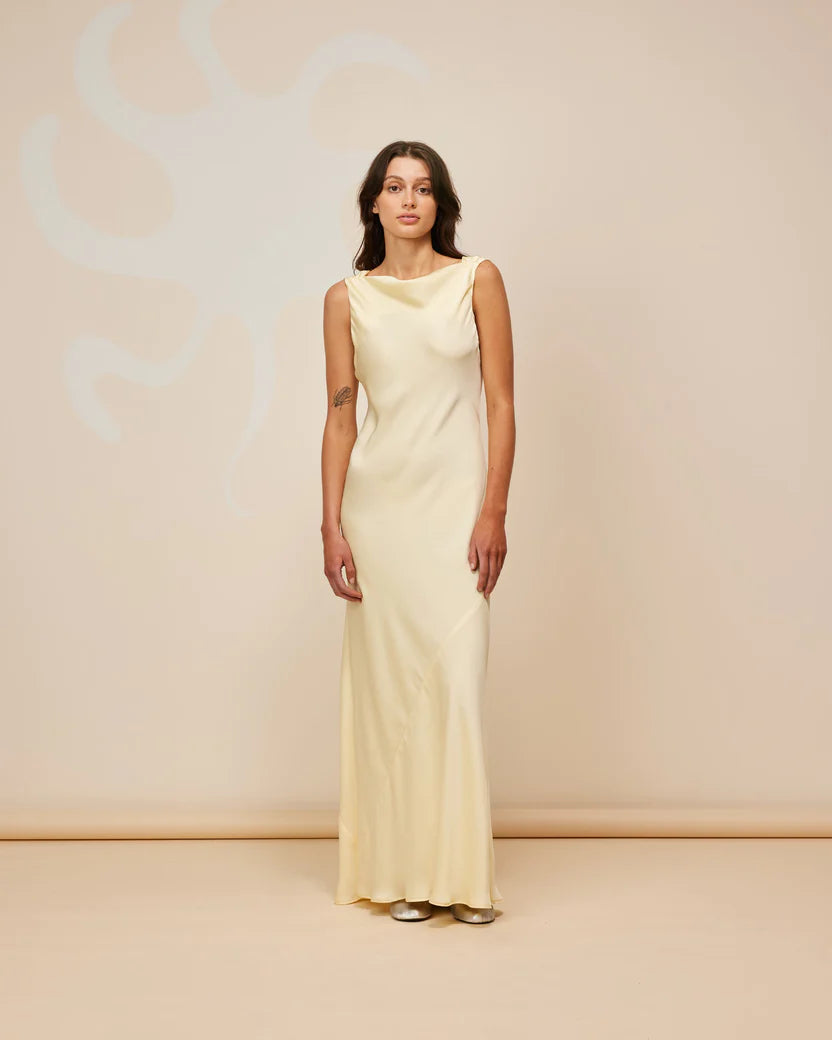 ◦ Sleeveless midi dress crafted in rich butter satin