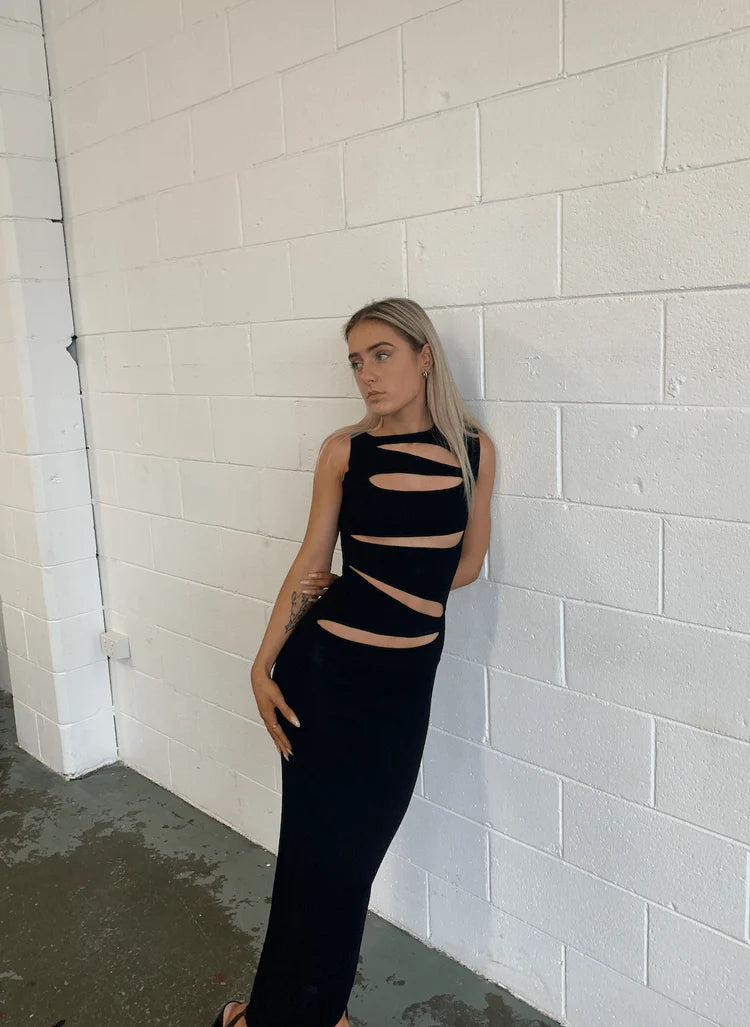 The Slashed Knit Dress is crafted from a luxe knit and features asymmetrical splits across the torso and back, creating a signature Christopher Esber silhouette. This sleeveless style leads into a column skirt.