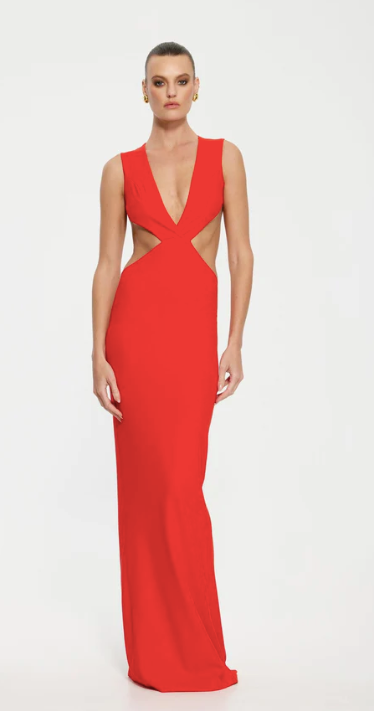 Valencia Gown is defined by the sharp V neckline and cutouts at the waist. Perfect for glamorous evening events, it's made from stretch scuba crepe that has a back split. Style yours with barely there metallic heels.